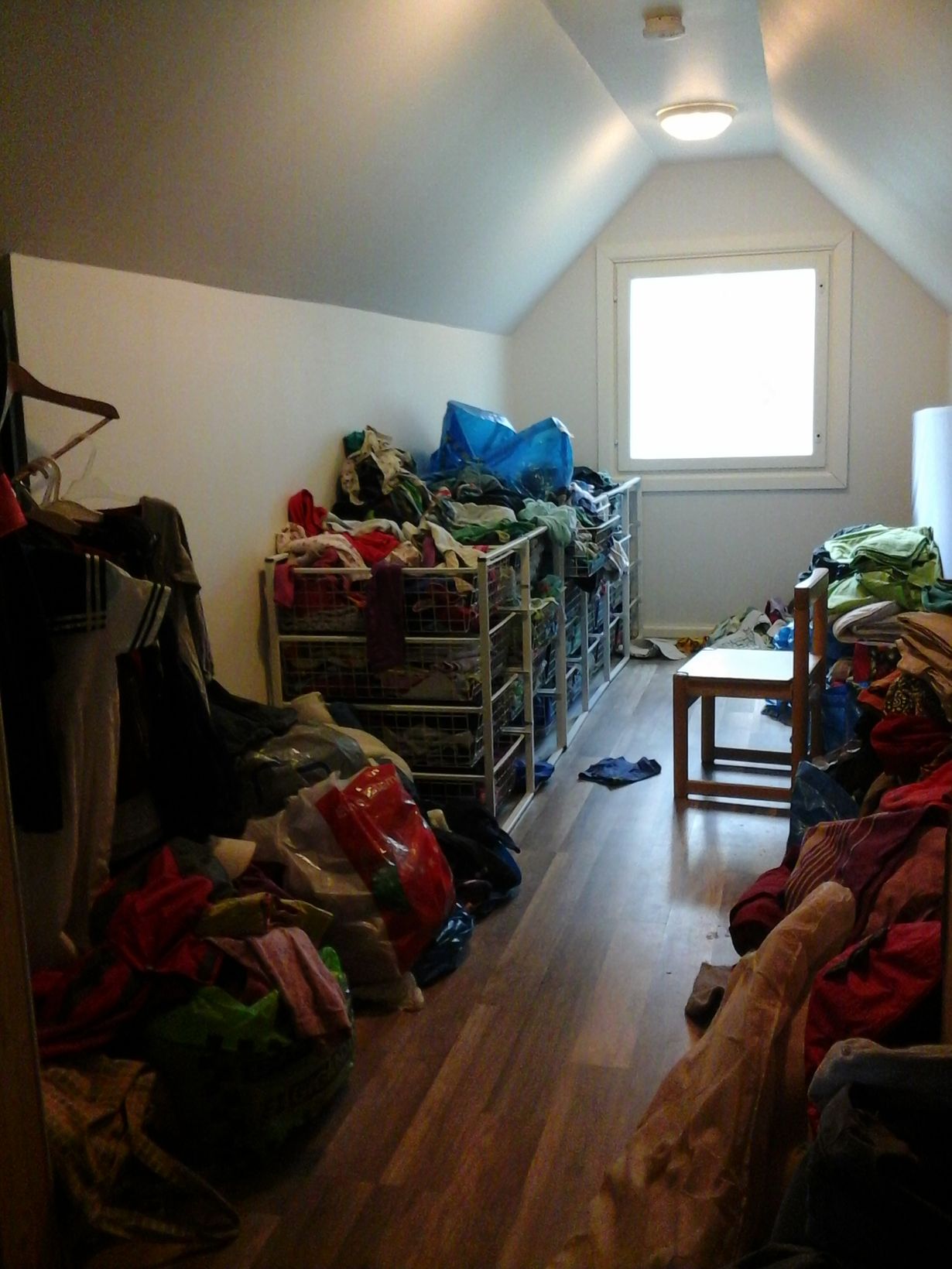 Kolme kovaa vauhtia kasvavaa lasta, pieneksi jääneet vaatteet, serkuilta saadut vanhat vaatteet, jotka vielä isoja, keskeneräiset säilytysratkaisut = mahdoton yhdistelmä!