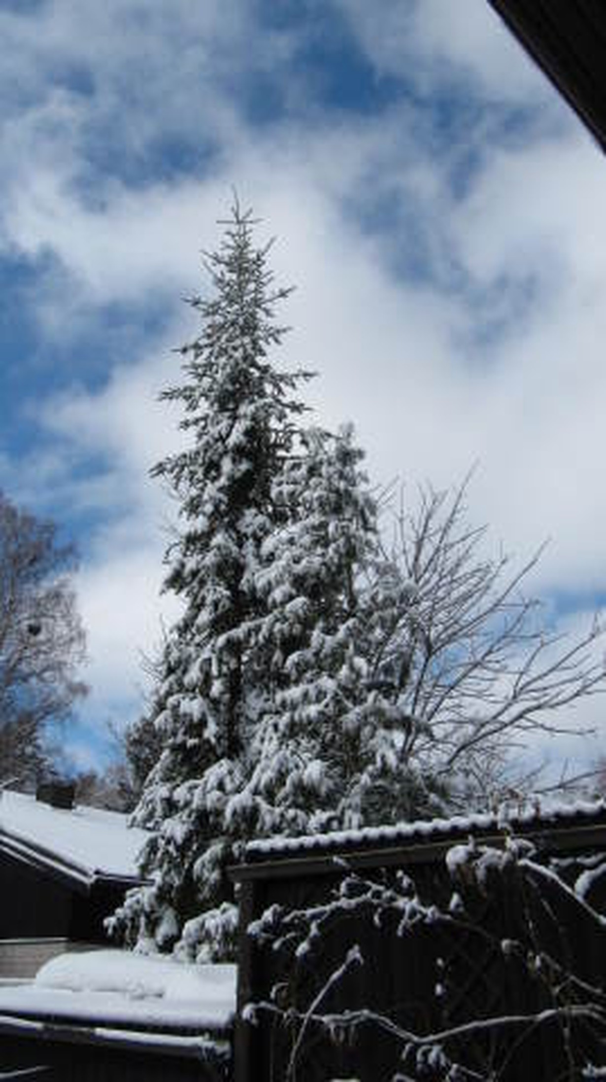 25.3. klo 11, aurinko tuli esiin, mutta yöllö satanut lumi pysyi puissa.