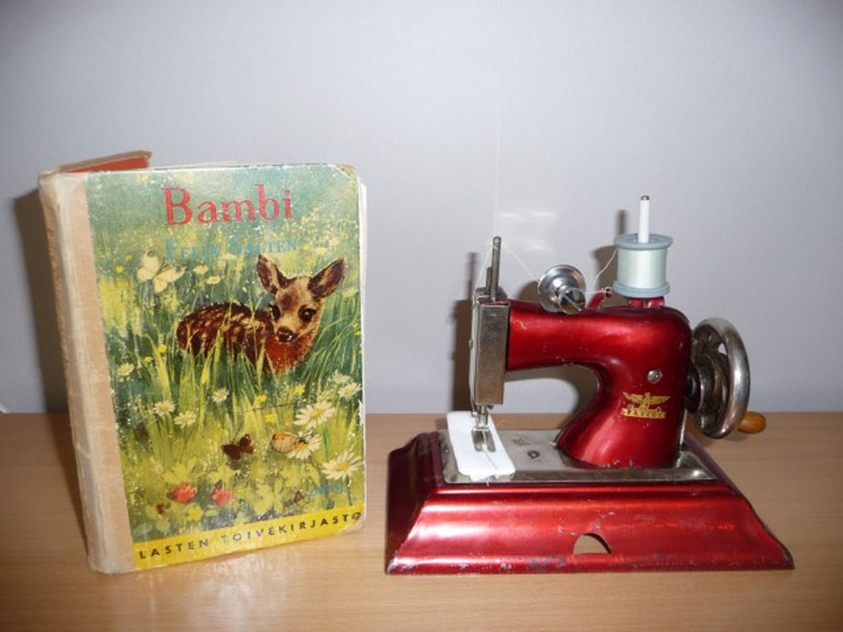 Oli vuosi 1958,kun ompelukone tuli minulle 6-vuotiaalle pienelle tytölle posti pakettina Floridasta. Olin juuri kotiutunut Helsingistä Invalidisäätiön sairaalasta,jossa vietin 5-vuotiaana pitkän tovin potilaana. Voi kuinka onnellinen olinkaan saatuani pienen punaisen koneen,jolla yritin kovasti ommella nukelle vaatteita. Lähettäjänä oli isovanhempieni kasvattityttö,joka oli aikuistuttuaan muuttanut Amerikkaan.Rakas Bampikirja on 9-vuotiana saamani syntymäpäivälahja isoisältä. Muistan kuinka isoisä kehoitti minua lukemaan kirjan jossain rauhallisessa paikassa ja samalla miettimään kirjan opettavaista sisältöä. Nyt ovat molemmat aarteeni olleet lastenlastemme käytössä, mutta tarkoin vaalittuna ja toivottavasti säilyvät vielä monta vuotta jälkeenikin tallessa.