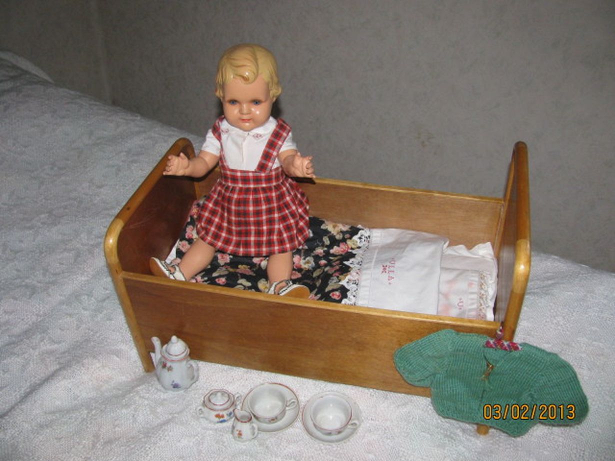 Olen sotaorpo. Olin 2v. kun isä kaatui v.1941.Minulla oli kaksi sotakummia Ruotsista joilta sain tämän nuken n. 4-vuotiaana.Nukella on kaunis lakattu sänky ja 2 osainen kahviastiasto. Nuken nimi on Ulla joka on kirjailtu lakanaan.Nuken mukana tuli paljon erilaisia vaatteita sekä kauniit valkoiset kengät.Nukella on leikitty paljon ja vaikka sillä on ikää jo 70 vuotta, se on edelleen hyvässä kunnossa.