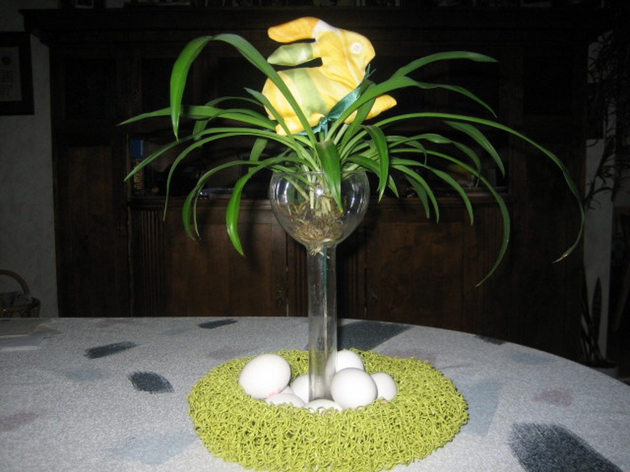 Olen neulonut paperinarusta tuon kranssin,jonka sisään keitän pääsiäismunat tarjolle.Korkeassa maljakossa on vihreänä rönsyliljan oksia ja juhlaan pääsee myös ajat sitten ommeltu pupujussi.Hyvää Pääsiäistä.