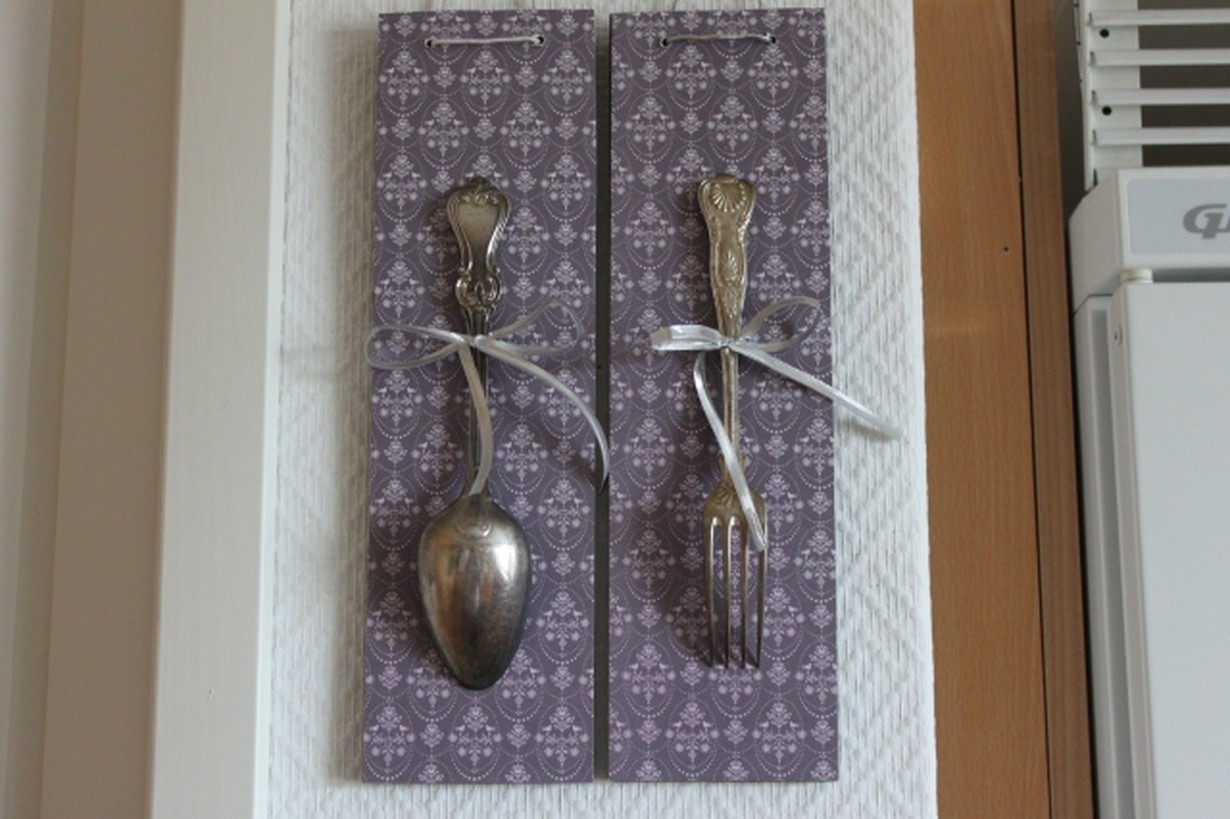 Kauniilla taustapaperilla päällystetyt vaneripalat ja nätillä rusetilla palaan kiinnitetyt ruokailuvälineet toimivat kotimme keittiön koristeena wanhaa kunnioittaen.