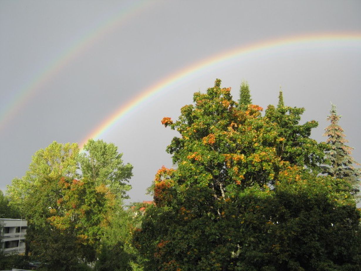 Kesti vain ihan lyhyen aikaa, kun näin kauneimman sateenkaaren. Se lähti ikkunan alta lammesta ja loppukin näkyi. Värit olivat erittäin kirkkaita. Sieppasin kameran ja otin kuvan parvekkeelta. Se hävisi saman tien.