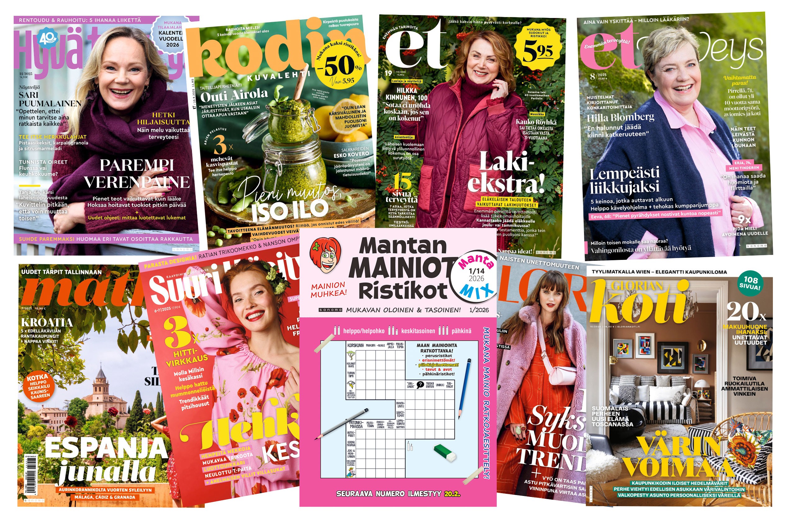 Osallistu arvontaan ja voit voittaa kolmen kuukauden tilausjakson valitsemastasi Sanoman aikakauslehdestä: Gloria, Glorian Koti, ET-lehti, ET Terveys, Hyvä terveys, Kodin kuvalehti, MantaMix, Matka ja Suuri käsityö.
