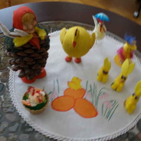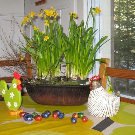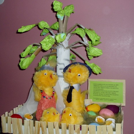 Pajunkissat, narsissit, rairuoho, tiput, noidat, jänikset ja virpomisoksat kuuluvat pääsiäiseen. Pääsiäispöydän herkkuja ovat koristellut kananmunat, suklaamunat ja mämmi.