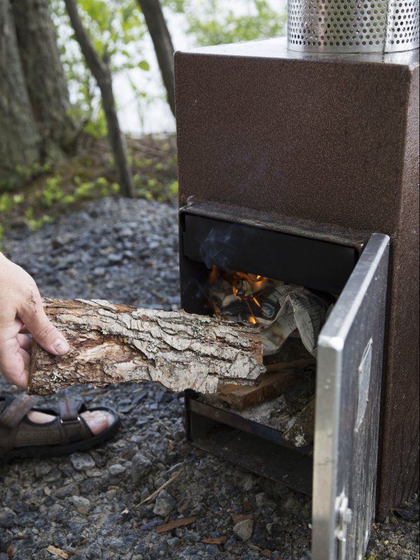 Sisäosa muovia, verhoiluna petsattu kuusi. Ulkokamiina.