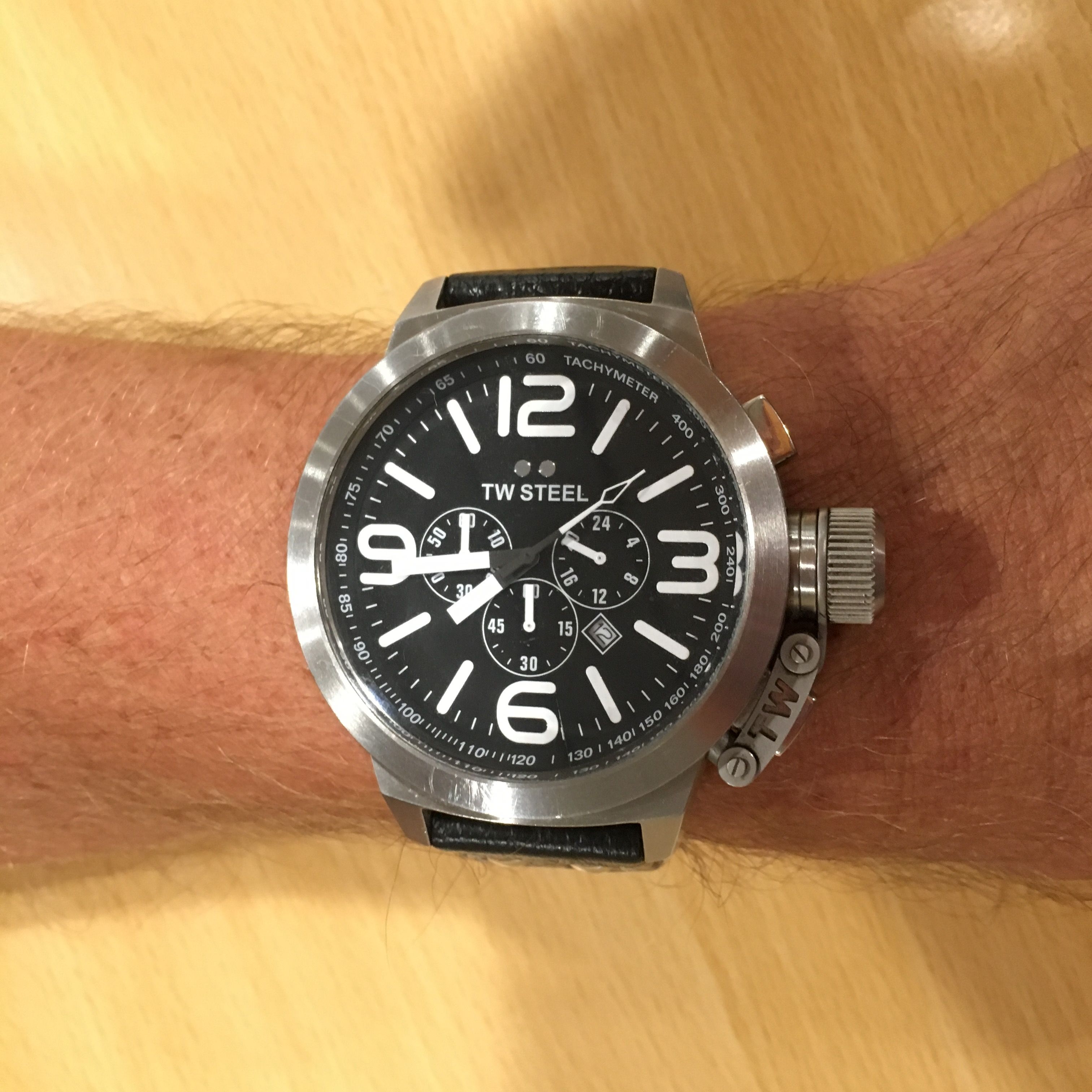 Pidän kelloista, mutta vihaan sellaisia, joista ei näe aikaa kunnolla. Sen takia käytän isoja malleja. Minulla on useita kelloja ja kaikissa niissä on iso taulu. Haluan myös tuntea ranteessa, että minulla on kello. Tässä TW Steelissä on isot nupit ja tätä on helppo käsitellä. Minulla on toinen samanmerkkinen, se on nelikulmainen.