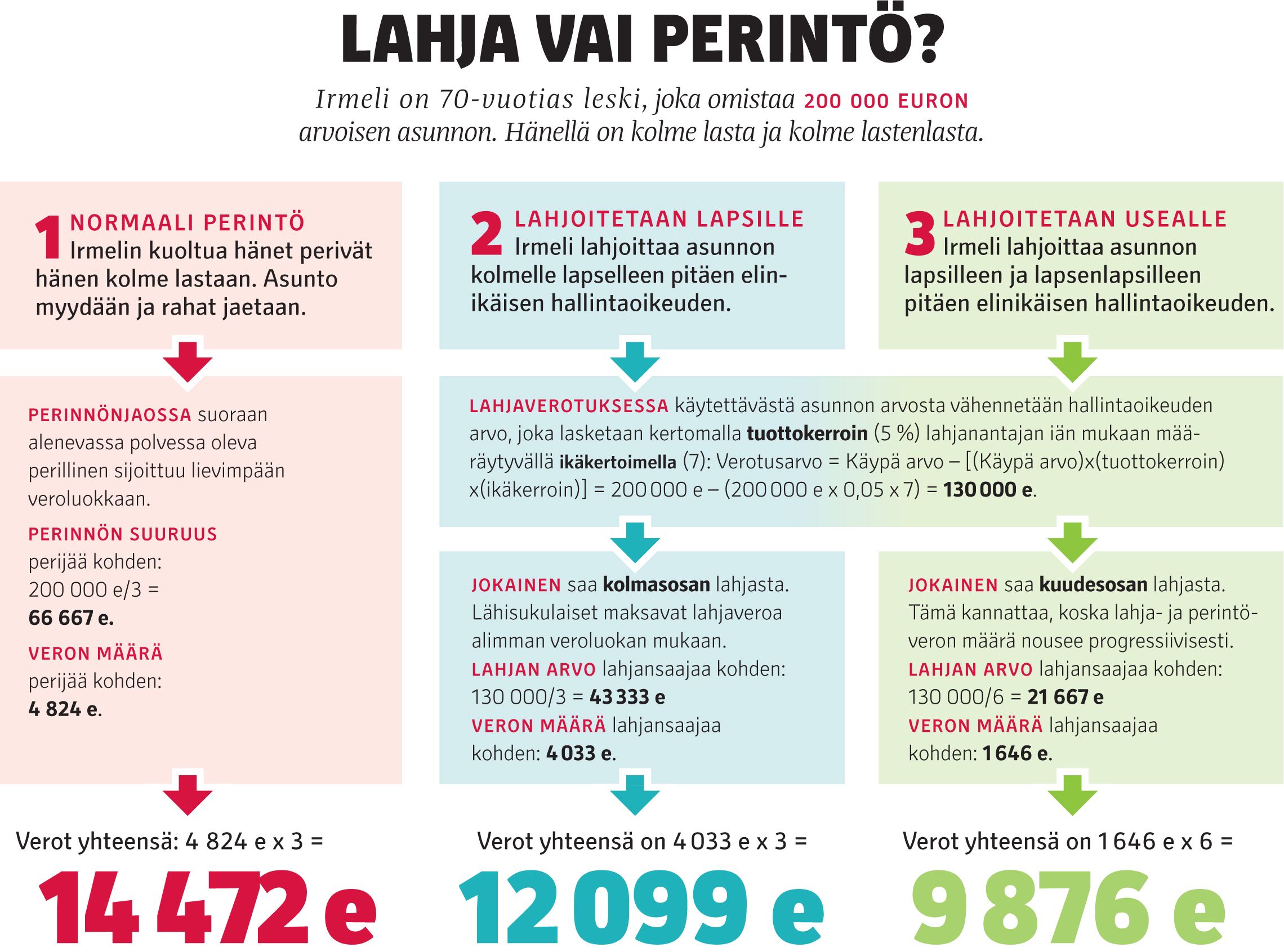 Laskelman mukaan edullisinta on asunnon lahjoittaminen eläessään perillisille. Kannattaa muistaa, että verot pitää maksaa heti, vaikka asuntoa ei voi muuttaa rahaksi lahjoittajan hallitessa sitä. Laskelman teki oikeusnotaari, toimitusjohtaja Ville Kaituri, lakivälitys.fi