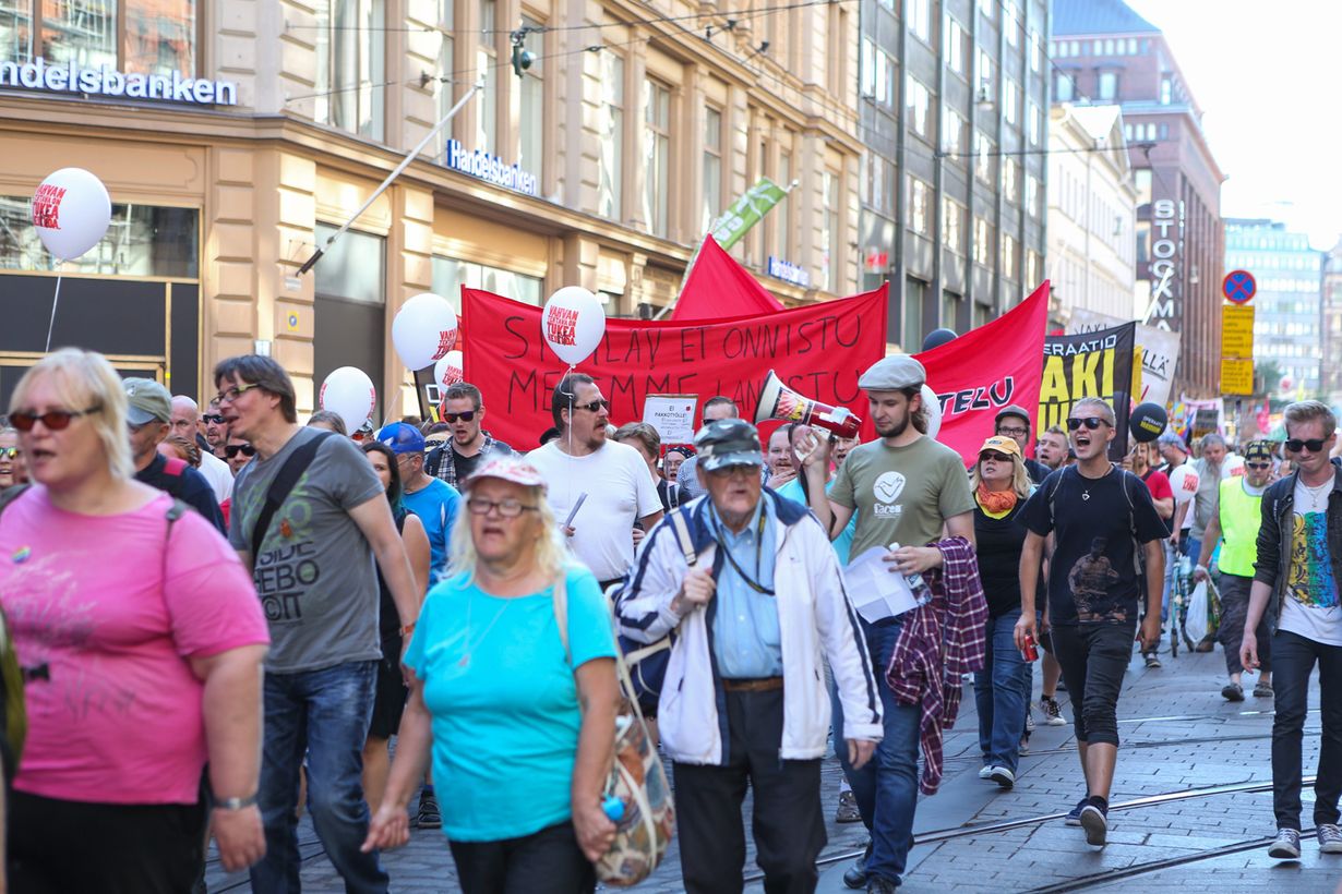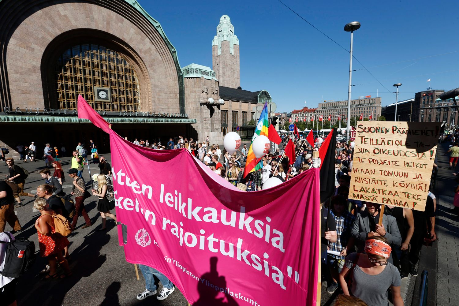Tämä mielenosoitus hallituksen leikkauksia vastaan järjestettiin elokuussa Helsingin keskustassa.