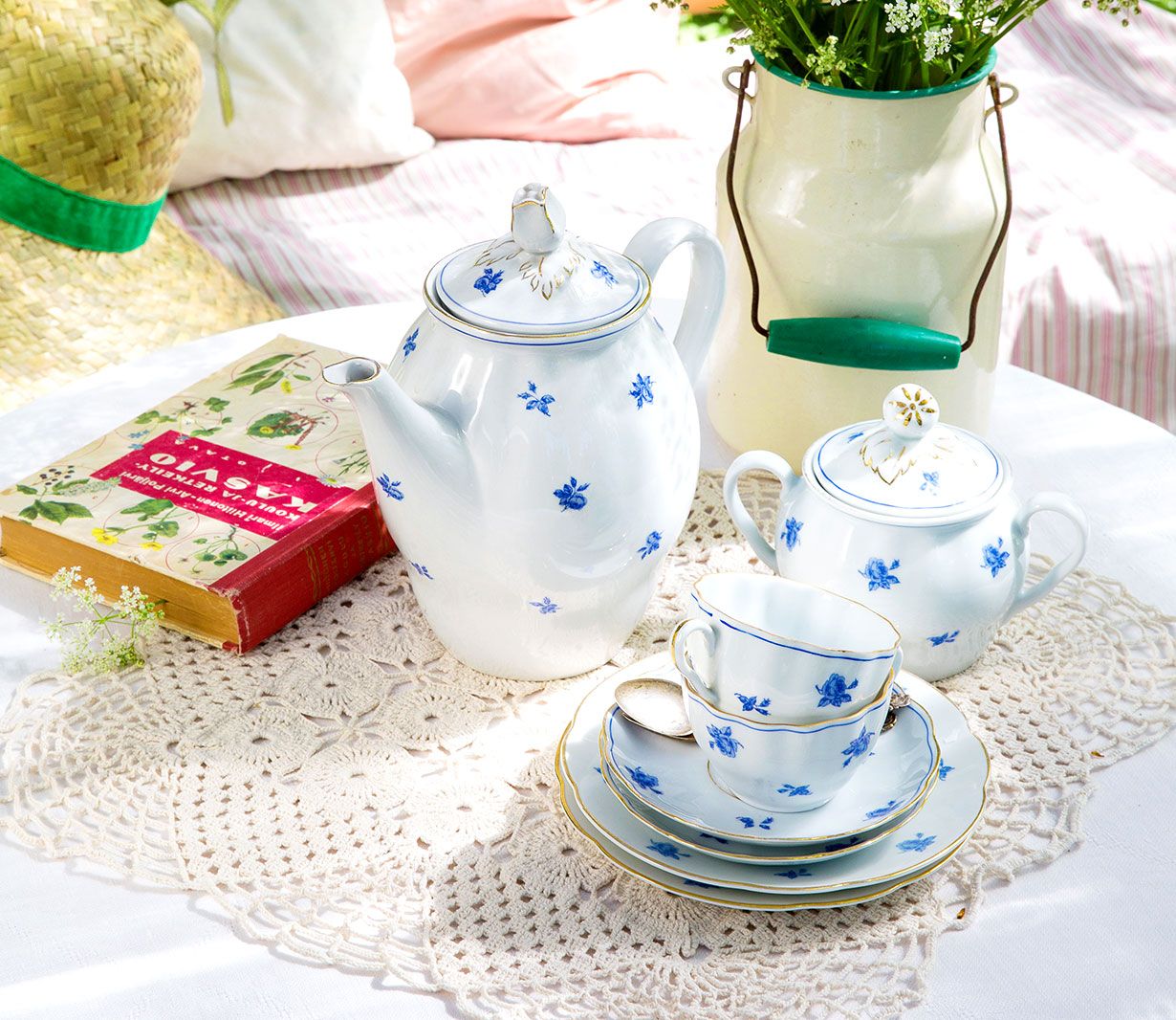 Greta Liisa Jäderholm-Snellmanin suunnitteleman OB-malliston kahvikuppi 26 euroa, kukkalautanen 15,50 euroa, sokerikko 42 euroa ja kahvikannu 87 euroa.