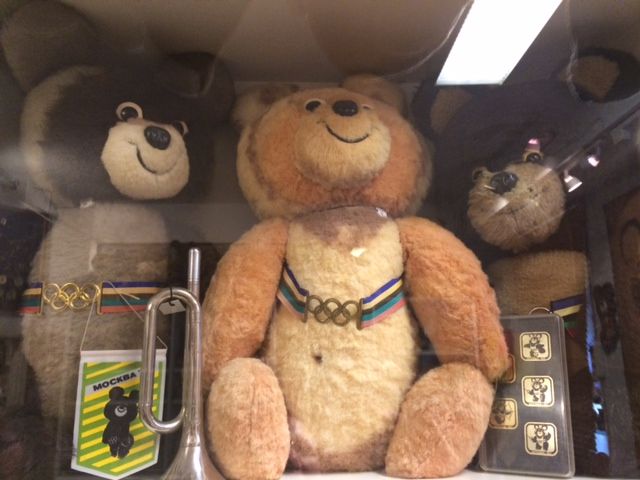 Miska-karhut tönöttävät vitriinin takana, olympiarenkaat ympärillään. Vuoden 1980 Moskovan olympialaisten kisamaskotit tehtiin vankileireillä, kertoo nalletohtori Anne Kautto.