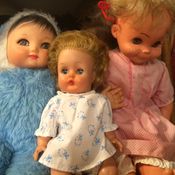 Puolalaisia nalleja lepää seinämillä useampia. Isot keltaiset nallet olivat 50–60-luvuilla suosittuja ja edullisia.