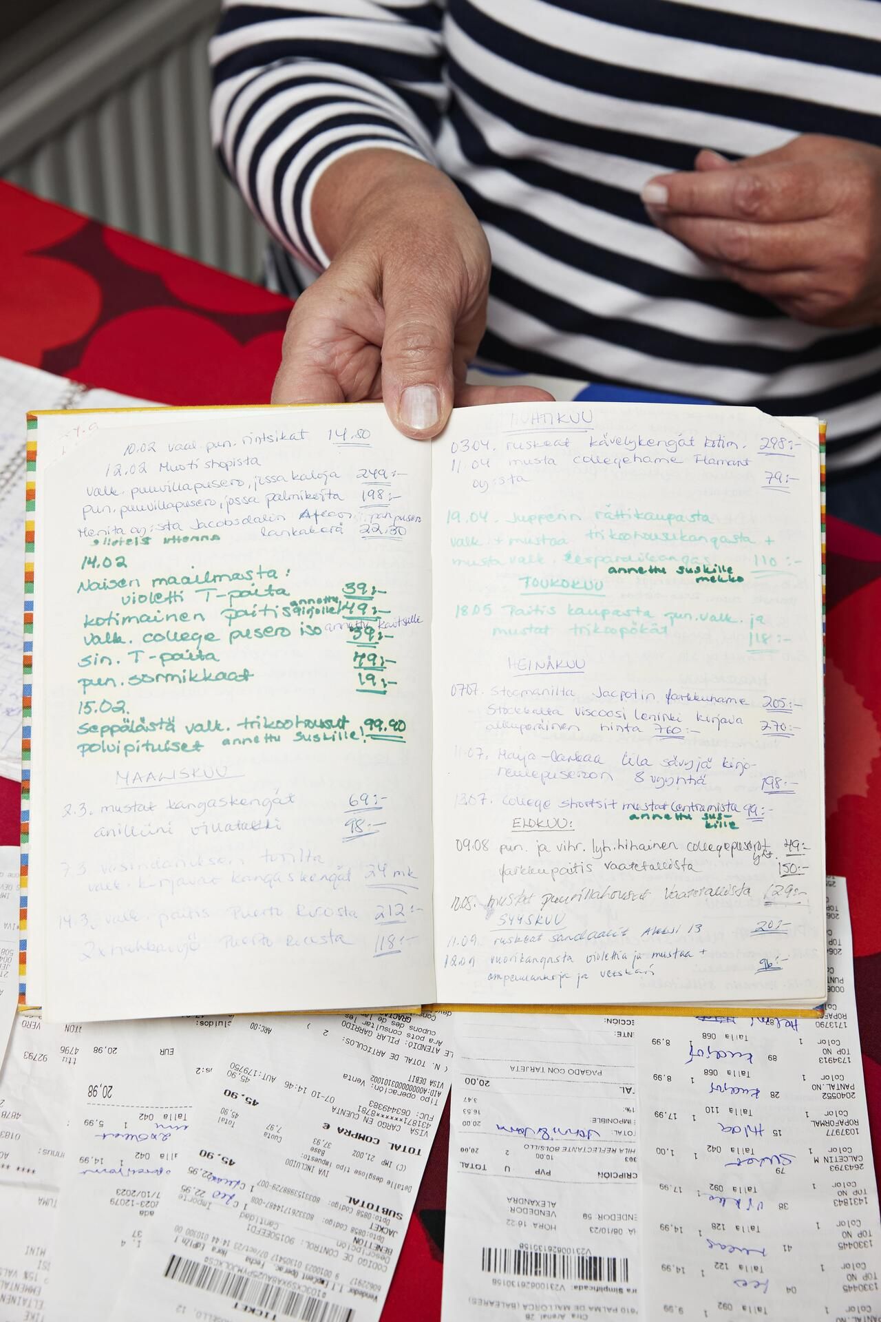 Kymmenien vuosien kokemuksella ostosten kirjaaminen on Varpulle yhtä arkipäiväistä kuin ruokakaupassa käyminen. Hän kirjat menorivit heti kaupasta tultuaan.