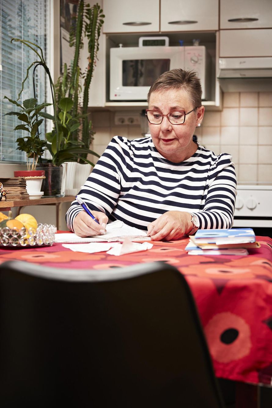 Espoolainen Varpu Klemola, 61, kirjaa ylös kaikki ostoksensa. Listoista hän on oppinut, missä kaupassa ei kannata käydä ja paljonko takit maksoivat 30 vuotta sitten.