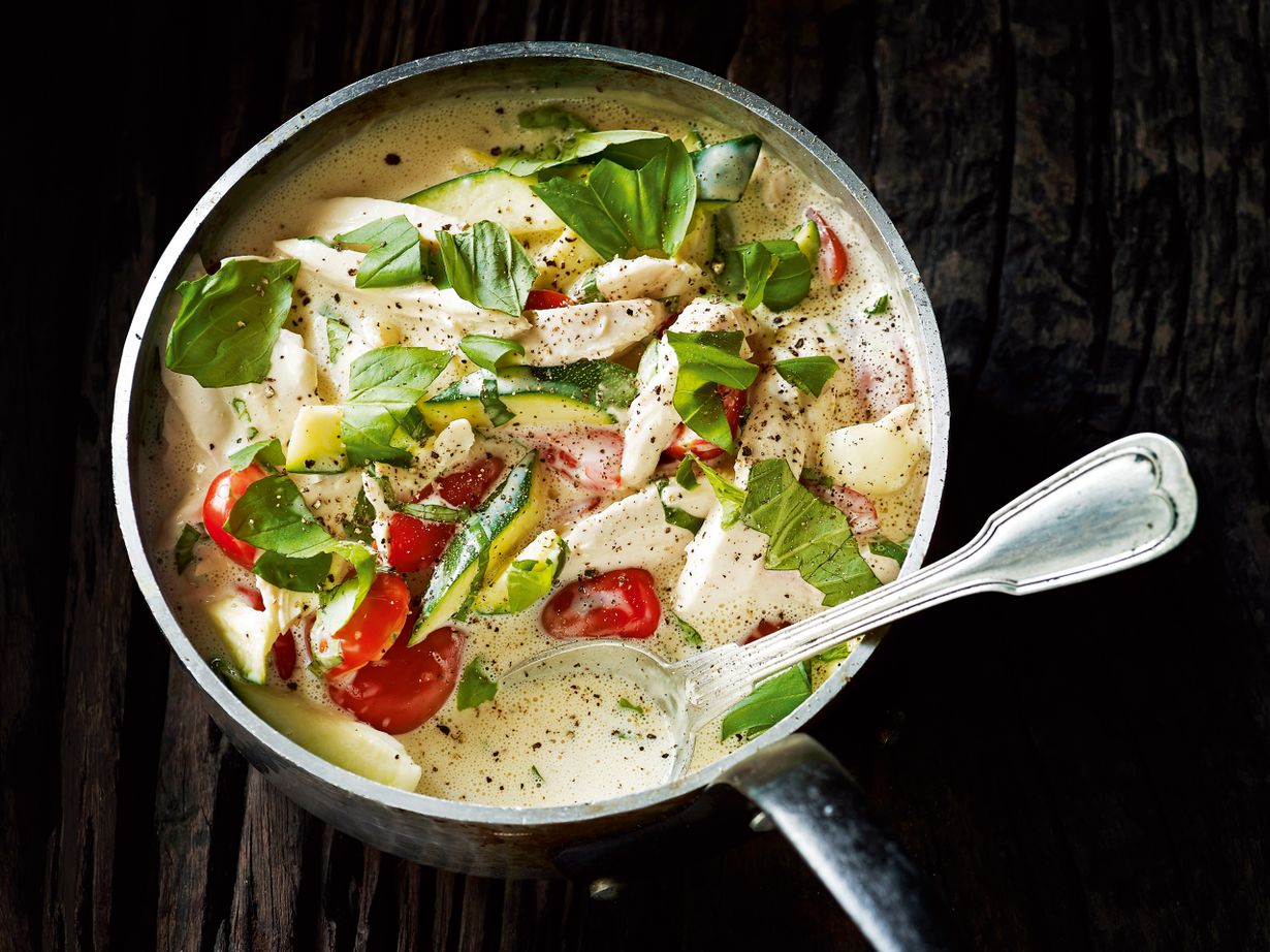 Kanaviillokki kesäkurpitsan, tomaatin & basilikan kera