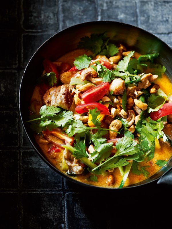 8. Siirrä liha nesteineen päivineen takaisin vokkiin. Lisää kookosmaito, kalakastike ja tamarindi ja anna ainesten kiehua hiljalleen, kunnes liha on mureaa ja neste kiehunut kokoon (noin 30 minuuttia). Mausta suolalla ja pippurilla, lisää tarvittaessa tilkka limettimehua. Siirrä paistos tarjoilukulhoon.
