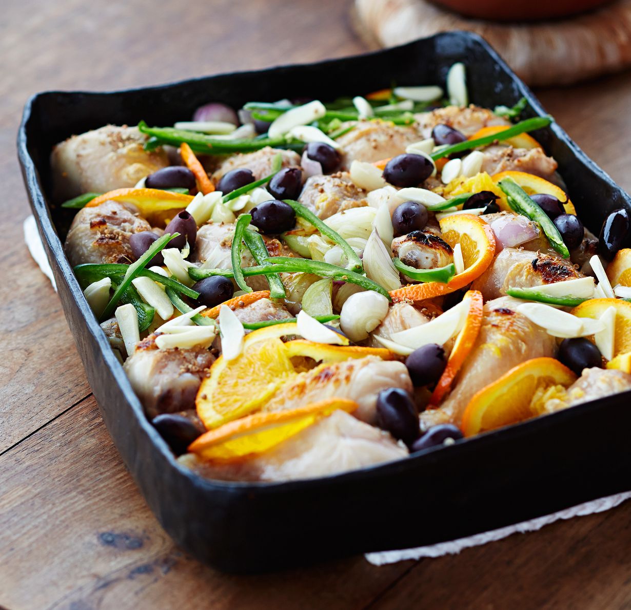 - Ota broilerit uunista. Lisää joukkoon appelsiiniviipaleet, chilit, sipulit ja oliivit. Sekoita appelsiinimehu ja oliiviöljy ja kaada uunivuokaan. Jatka kypsennystä noin 35 minuuttia.