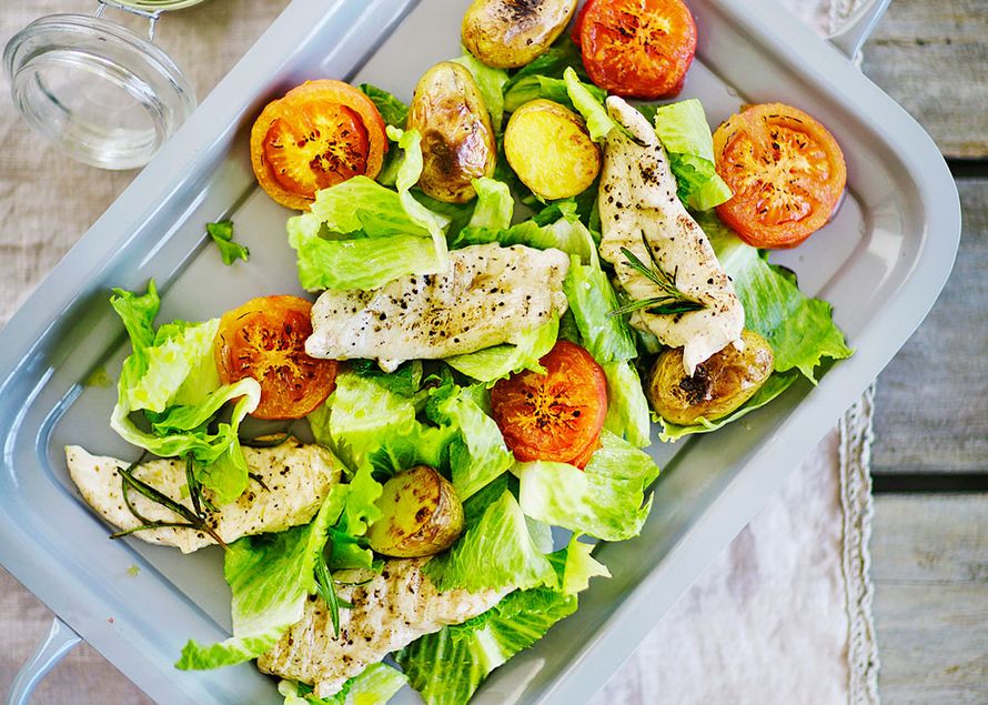 - Nosta kuumat kasvikset ja broileri rapean salaatin joukkoon. Lisää halutessasi parmesaanilastuja. Tarjoa itse tehdyn ruohosipulimajoneesin kanssa.