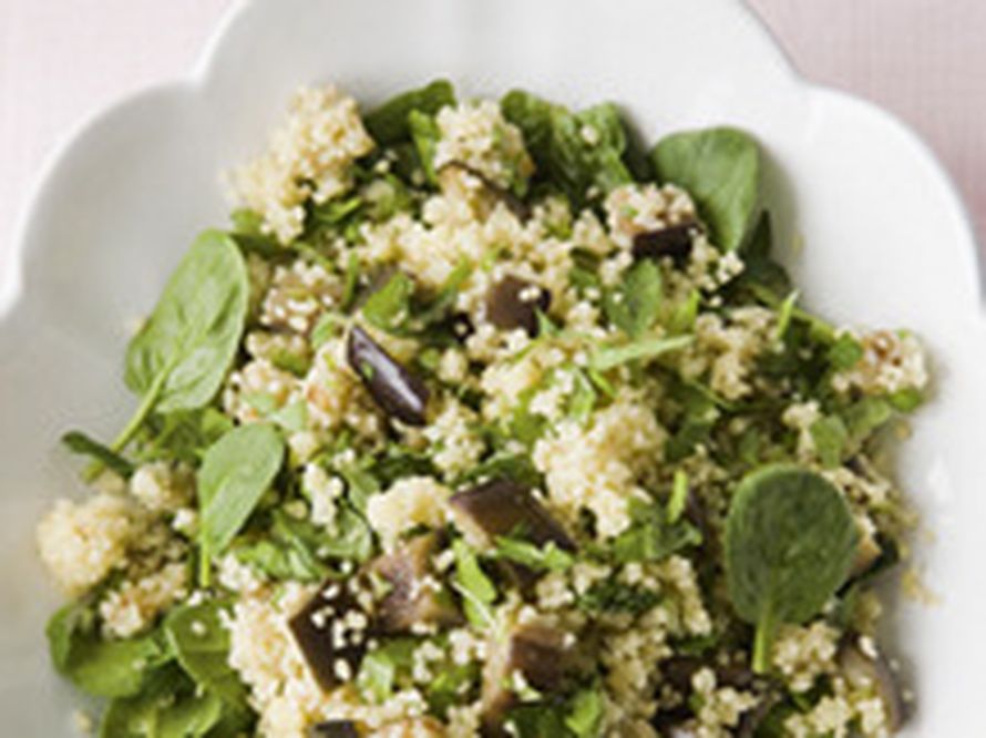 1 pieni munakoiso3 valkosipulinkynttä¾ dl oliiviöljyä1 rkl valkoviinietikkaa6 dl vettä1 tl suolaa1 dl oliiviöljyä3 dl täysjyvä-couscousta1 dl silputtua minttua1 dl silputtua lehtipersiljaa(tuoretta pinaattia)