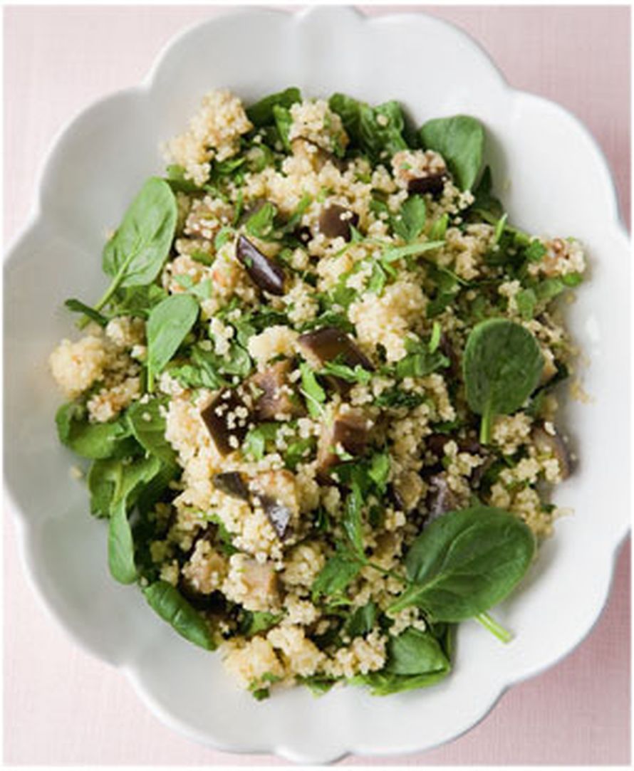 Sekoita couscous irralliseksi ja lisää munakoisot joukkoon. Lisää loput