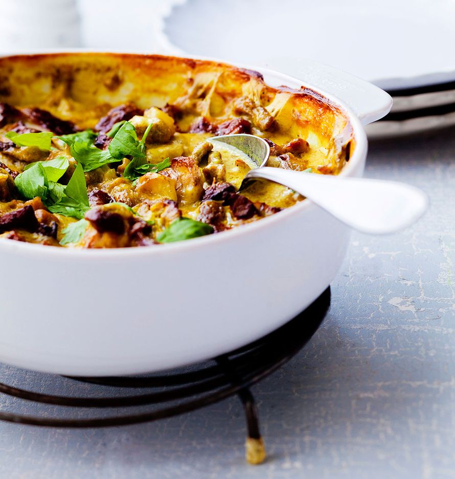 - Lado uunivuokaan kerroksittain lihasuikaleita ja banaaniviipaleita. Lisää suolaa kerroksiin maun mukaan. Kaada kerma vuokaan.
