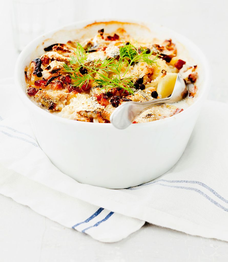 - muutaman kerroksen verran. Jätä perunoita päällimmäiseksi.