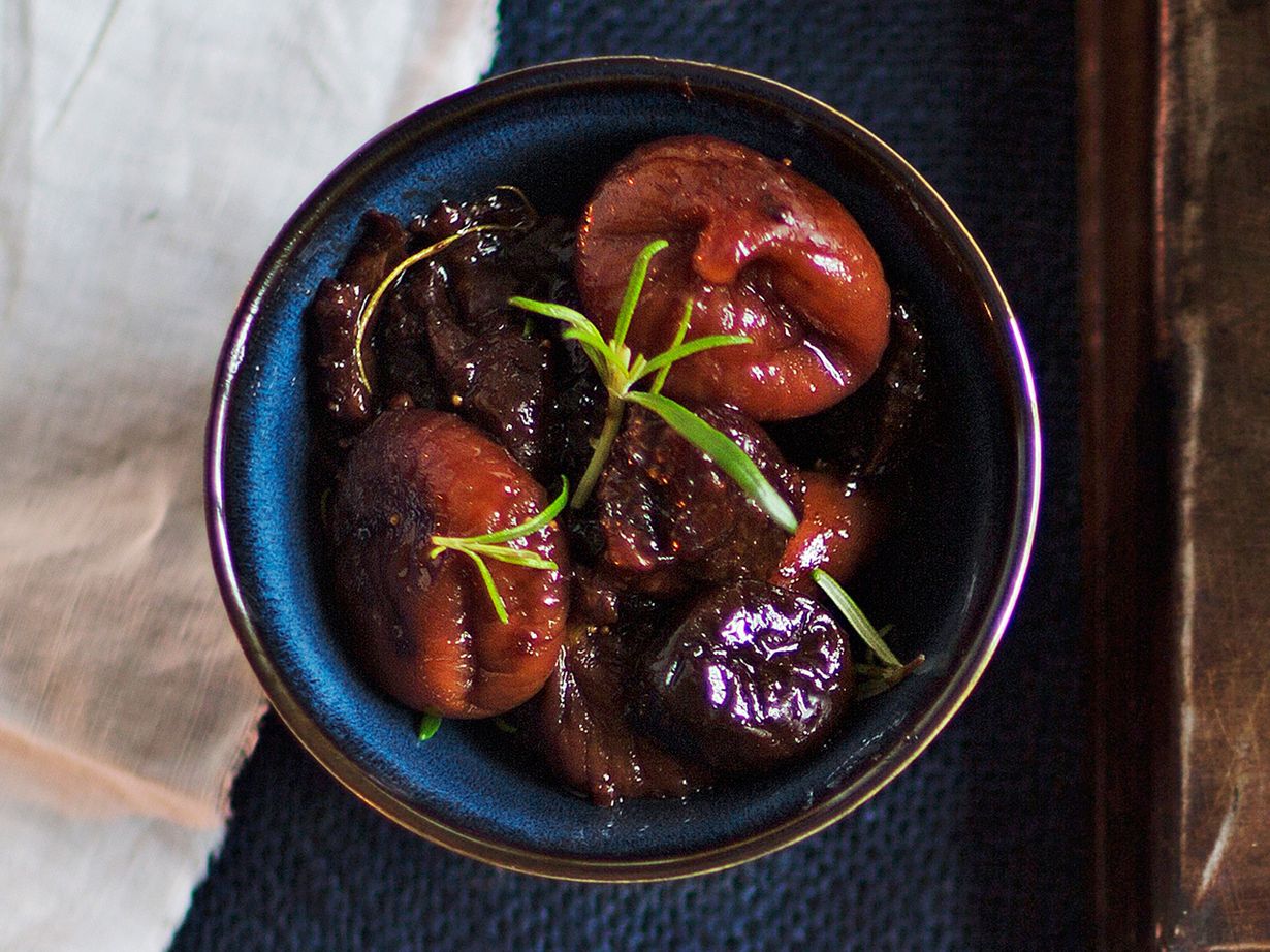 - Kuumenna glögi. Lisää joukkoon tuoreen rosmariinin oksat sekä kuivahedelmät. Hauduta hedelmiä 15 minuuttia.
