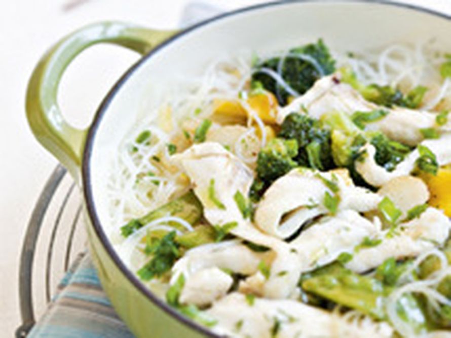 200–300 g:n haukifilee2 rkl öljyä2–3 tl karri- tai paprikajauhetta1 iso sipuli tai pieni purjo400–500 g vokkivihanneksia½–1 prk maustettua ruokafraichea(suolaa, mustapippuria)2 hengen annos nuudeleitatuoretta vihreää (ruohosipulia, persiljaa, kirveliä)