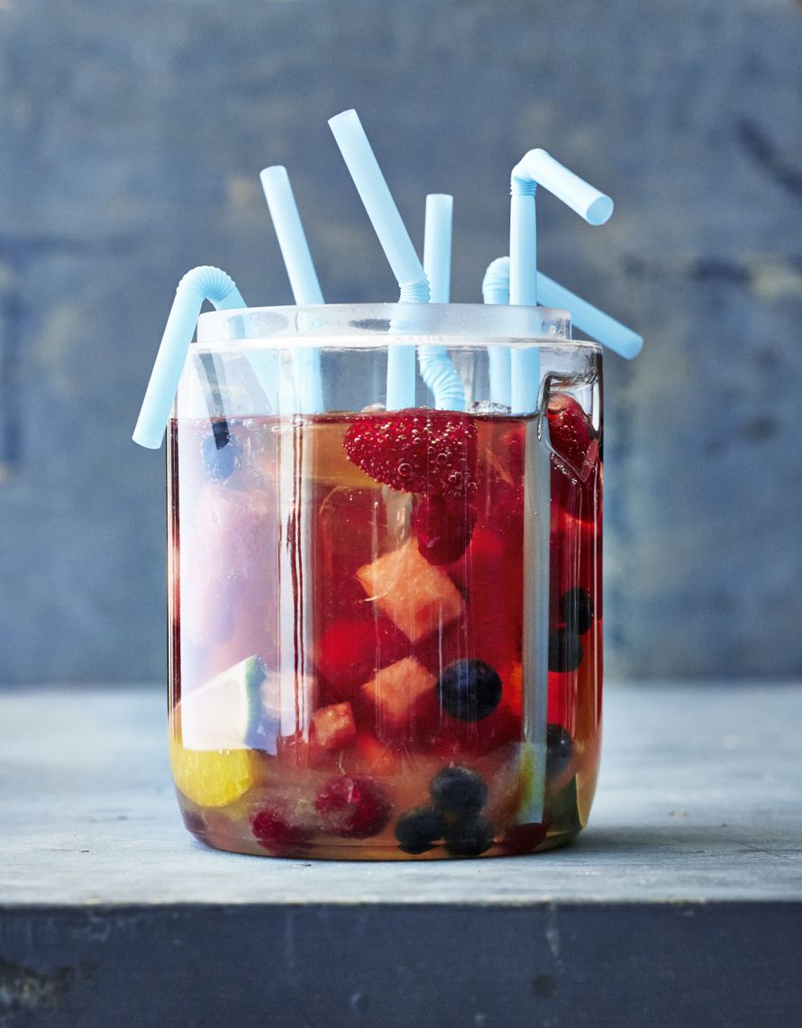 "Tämä alkoholiton juoma avaa meillä puutarhajuhlat, mutta toimii myös janojuomana, kun puuhastelee pitkään pihatöissä. Lohkon maljaan hedelmiä ja raikkaita marjoja sesongin mukaan.