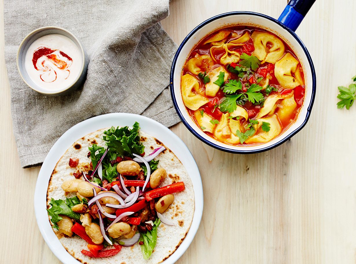 - Kasaa tortillojen päälle salaattia, papu-pekoniseosta ja punasipulia. Tarjoa kastikkeen kanssa.