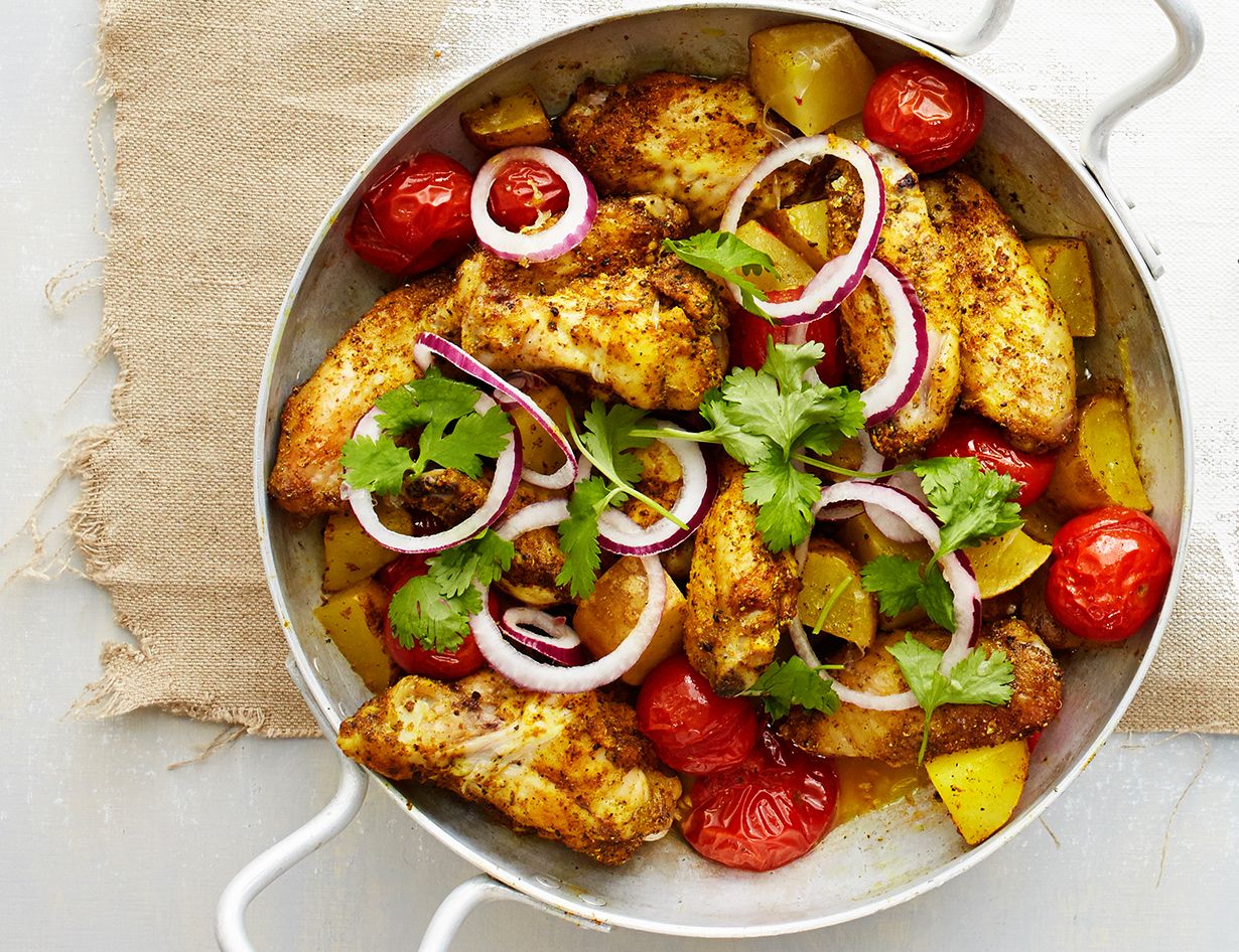 - Sekoita mausteet kulhossa ja kieritä broilerinsiivet mausteseoksessa. Nosta siivet uunivuokaan.