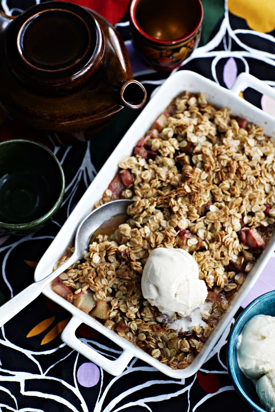 - Paista uunin keskitasolla 20-25 minuuttia, kunnes raparperit ovat pehmenneet. Tarjoa raparperikaura vaniljajäätelön kanssa.