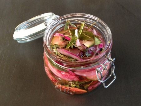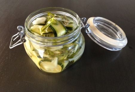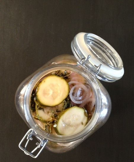 - Lado kesäkurpitsaa, sipulia ja timjamin oksia kerroksittain puhtaaseen purkkiin.