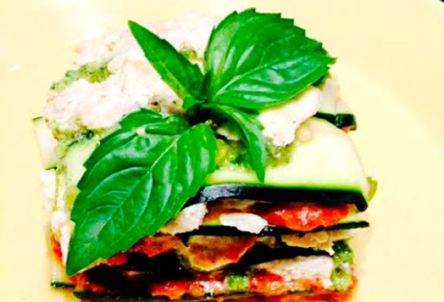 seuraavaksi juustokastiketta, se levittyy paremmin suoraan kurpitsan päälle. Seuraavaksi pestoa ja viimeiseksi tomaattikastiketta. Sitten taas kesäkurpitsaa. Jatka näin niin pitkään kuin aineksia riittää. Anna lasagnen vetäytyä hetki jääkaapissa kelmulla peitettynä.