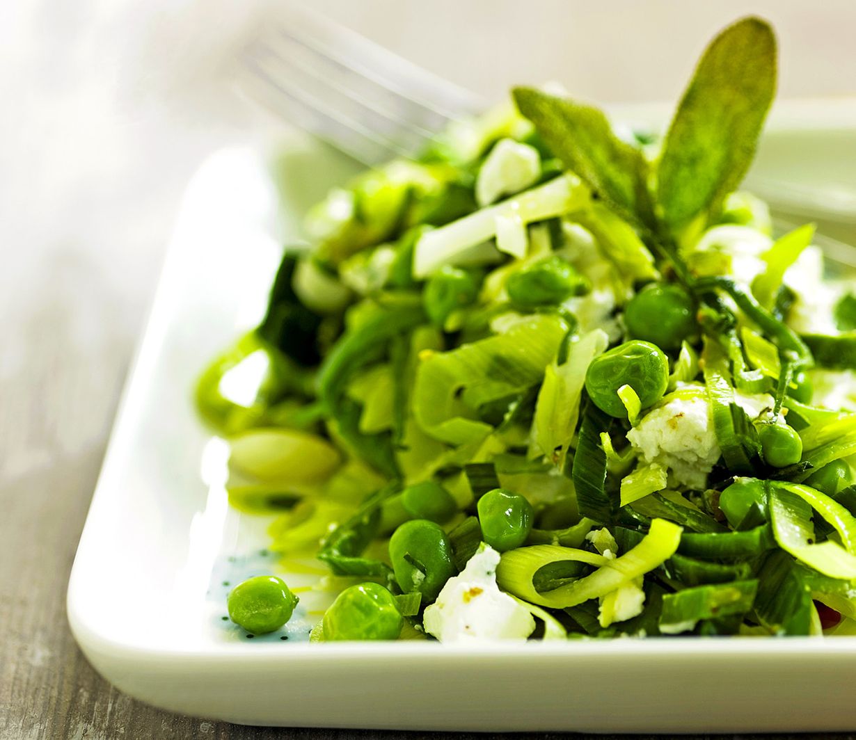 valkosipuli. Kuullota sipuleita pannulla oliiviöljyssä. - Lisää joukkoon herneet ja jatka paistamista muutama minuutti. Murenna pannulle feta ja lisää silputtu salvia. Viimeistele höystö rouhitulla mustapippurilla.