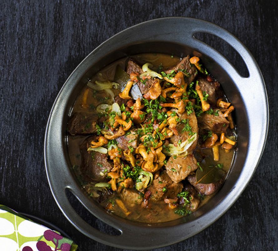 - Pata on valmis, kun liha on lähes ylikypsää. Paista pannulla siansivukuutiot, kantarellit ja sipuli. Lisää ne pataan ja ripottele päälle persiljaa.