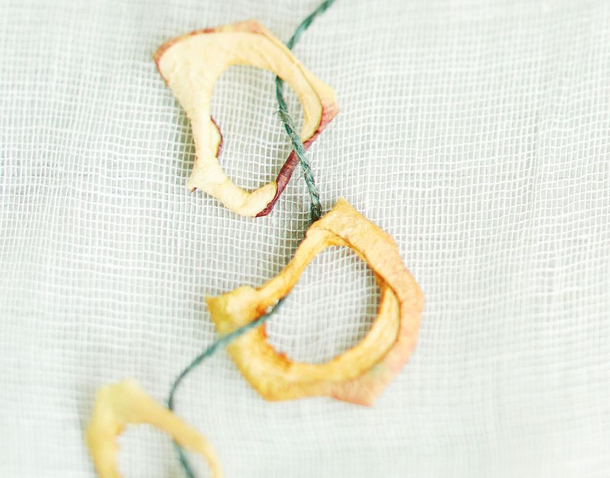 - Leikkaa omenat hyvin ohuiksi rinkuloiksi. Pujota naru läpi kotareiästä siivu kerrallaan. Älä tee omenanauhasta liian tiivistä.