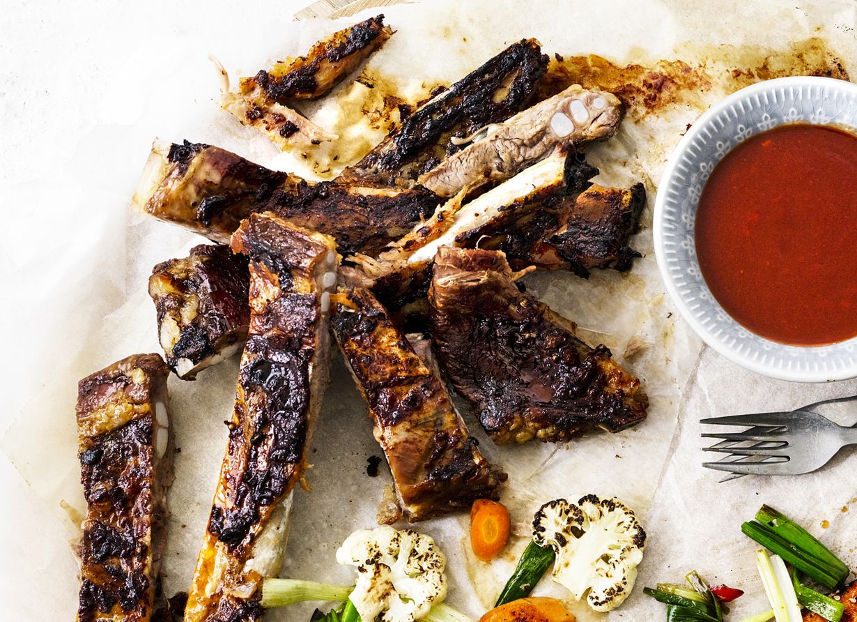 - Grillaa ribsit kuumassa grillissä, noin 10 minuuttia. Leikkaa ribsit annospaloiksi terävällä veitsellä luiden välistä.