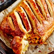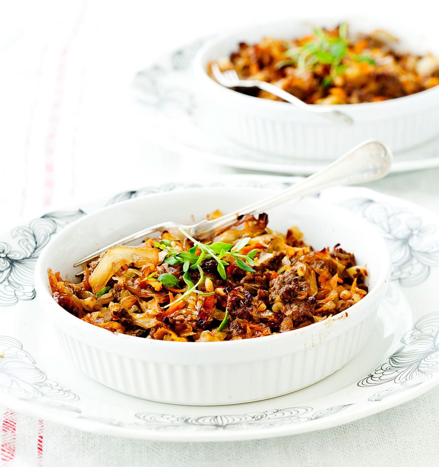 - Leikkaa kaali ohuiksi suikaleiksi ja kuullota hetki paistinpannulla rasvassa. Mausta siirapilla ja suolalla. Kumoa kaali uunivuokaan.