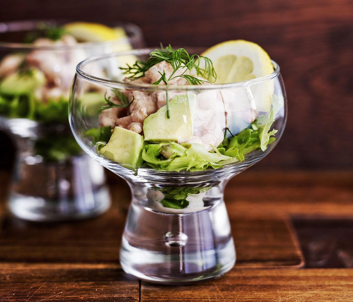 - Kokoa annokset. Asettele salaatti annosmaljojen pohjalle, päälle avokadot ja katkaravut. Koristele annokset tillillä ja sitruunalohkoilla.