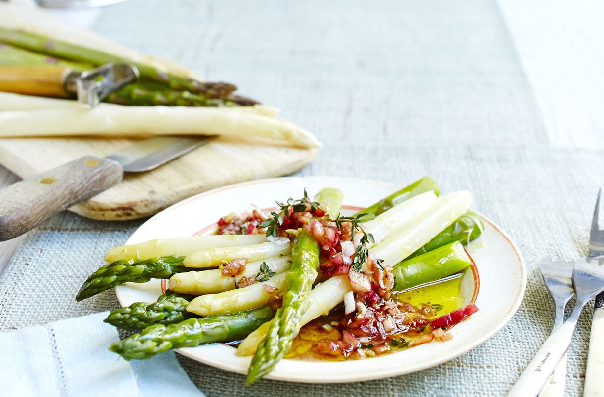 - Asettele parsat tarjoiluvadille ja levitä päälle punasipuli-vinegrettiä.