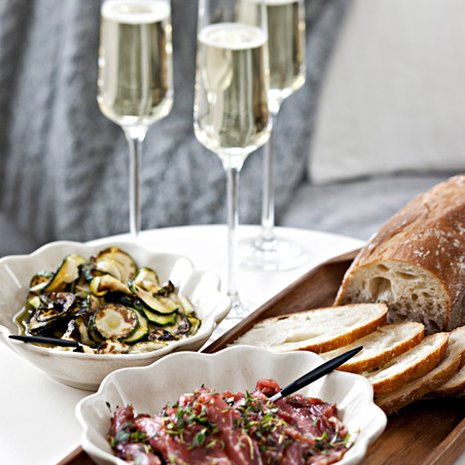 2. Pese kesäkurpitsat ja leikkaa ne juustohöylällä tai terävällä veitsellä ohuiksi pitkiksi viipaleiksi. Paahda viipaleet pannulla kummaltakin puolelta. Pistä kurpitsat kulhoon, johon laitat myös öljyn, sitruunan­mehun ja kuoriraasteen.