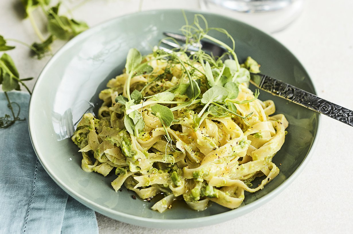 - Sekoita hernetahna pastan joukkoon ja ripottele päälle herneenversoja.