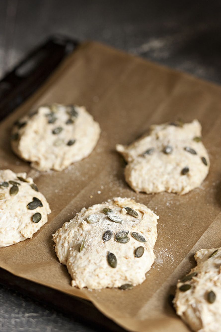 5. Pyöritä taikina jauhotetuin käsin sämpylöiksi tai lusikoi uunipellille leivinpaperin päälle. Ripottele pintaan kurpitsan-siemeniä.