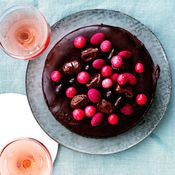 - Valmista kuorrutus. Sulata suklaa kerman kanssa kattilassa miedolla lämmöllä. Levitä puolet kuorrutteesta kakun väliin, loput päälle ja reunoille. Jäähdytä jääkaapissa.