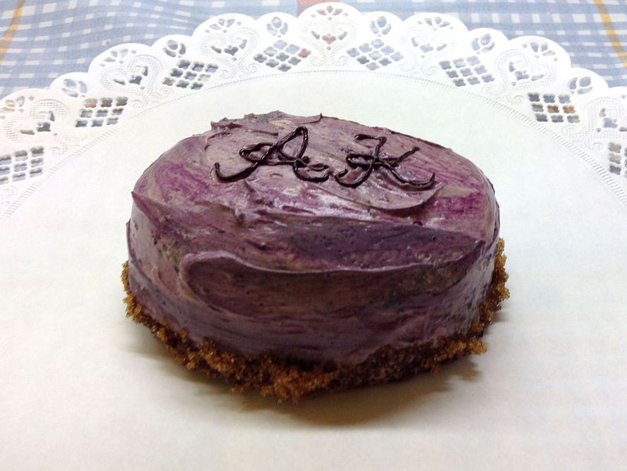 - Toinen osa leivoksesta laitetaan päälle ja sen pintaa hieman kostutetaan, jonka jälkeen koko pinta peitetään mustikkamokalla. Leivoksen alareunaan laitetaan noin sentin levyisesti fariinisokeria ikäänkuin hiekkapannaksi. Päälle kirjoitetaan sulatetulla suklaalla kirjaimet A.K.
