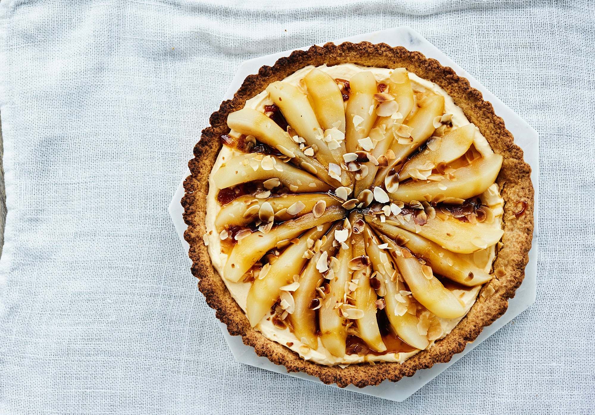 - Sulata sokeri pannulla. Varo ettei se pala. Lisää joukkoon tilkka päärynöiden keitinlientä, niin saat seoksesta juoksevaa. Valuta ”siirappi” päärynäpiirakan päälle. Paahda mantelit ja ripottele pinnalle.