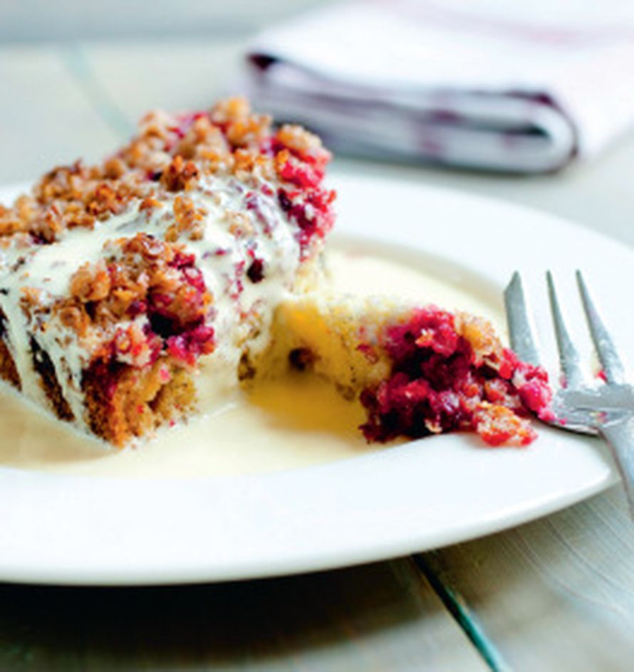 Puolukkapiiras saa pinnalleen rapean murupäällisen ja koko komeus nautitaan vaniljakastikkeen kera.