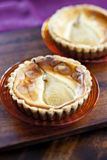 2. Jos käytät tuoreita päärynöitä, kuori ne ja keitä kypsiksi vaaleassa glögissä noin 15–20 minuuttia. Halkaise, poista siemenet ja asettele päärynät tartaletin pinnalle.