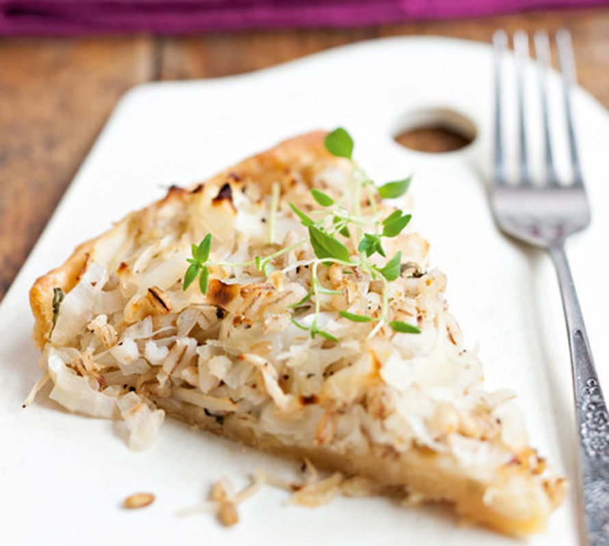 Kaalipiirakan pohjan voi tehdä itse hiivaleipäjauhoista tai käyttää valmista pakastepohjaa.